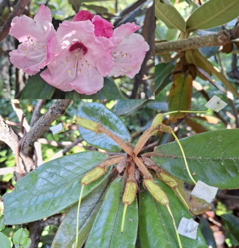 Planter introduceret af Cox er fra Kangding (R. bureavioides) har ovale blade, jævnt fordelt (ikke i totter), groft åbent et-laget indument, en stor calyx og griflen er kirtlet på den nederste del. Planten fra Warren Berg (R. novo? / danbaense) har aflange omv. ægformede blade, et enlaget indument, der hurtigt bliver orangebrunt (blødt, tæt tottet, næsten homogent), calyx lille og uldent og griflen ikke kirtlet. Blomsten mindre med korte støvdragere.