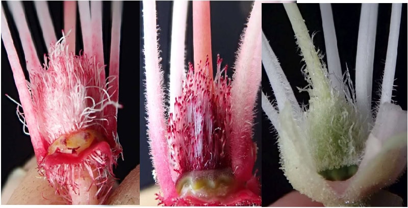 R. strigillosum R. strigillosum x burevii, R. bureavii, Ovarie støvdragere og griffel. Billedet viser bla. at kirtler på griflen er væk (recessiv arv). Den røde farve er dominant/intermediær.