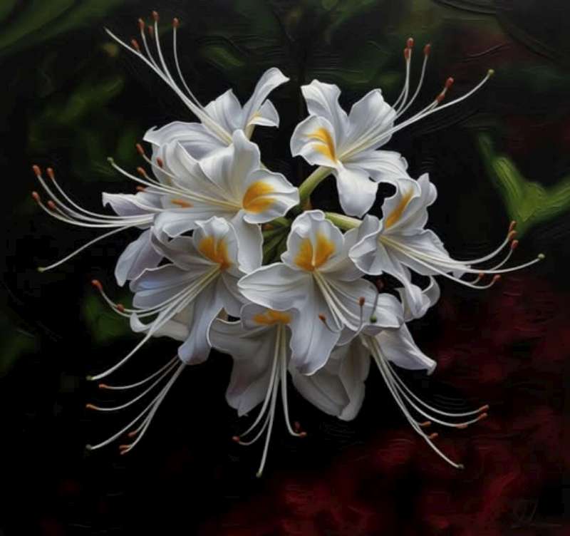 Alabama-Piemonte azalea hybrid. Løvfældende multi-stammede, opretstående, uregelmæssig spredende busk 1 til 2.5 m høj. Blomsterne er hvide, smalle tragtformet, 3-5cm lang og hyppigt er røret pink med eller uden en gul plet; Blomsterne åbner med bladene. Blomstringstidspunkt: begyndelsen af maj til midten af maj. Område: 6 til 7 Vildtvoksende: ALabama og Georgia Voksende på sure, fugtige til tør jord i delvis halv skygge. Yderligere oplysninger: fremragende hybrid, ofte med blå-grønt løv.