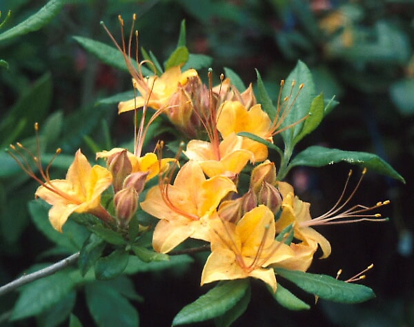 R. calendulaceum (Pentanthera) (-20 °C). En mellemstor, stift bygget, ret kraftigtvoksende løvfældende Nordamerikansk azalea. For haveejeren, som holder af kraftige farvesammensætninger, er denne art et fund, for den er let at dyrke og blomstrer i maj-juni med en så intens rød-orange glød, at den er umulig at overse. Planten er da også, på grund af disse egenskaber blevet anvendt som krydsningspartner i et utal af løvfældende azaleahybrider. Den har en pragtfuld høstfarve, men blomsten er desværre uden duft. Dyrkes bedst på solåben vokseplads. NØ U.S.A.