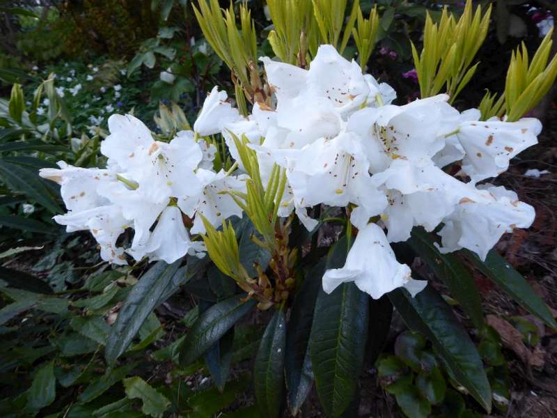 R. guihainianum (Fortunea). Træer, 7-8 m høje; unge skud ca. 4 mm i diam., Tomentose, glatte. Bladstilk kraftig, 1-2,5 cm, glatte; bladplade læderagtige, aflang-elliptiske til æglancetformet-elliptiske, 8-12 (-16) x 3-4,5 (-5,5) cm; basen bredt svag hjerteformet; bladspids spids med brod; bladundersiden grøn, glat; bladoverflade bleg grøn, glatte; midtribbe fremtrædende på bladundersiden, riflet på bladoversiden; tværgående vener 13-16-parret. Blomsterstand 5-8-blomstret; skaft 10-20 mm, glatte. Blomsterstilk 1-2 cm, glatte; blomsterbægeret uanseligt, diskformet (fladt), 5-fliget, glatte; Kronen bredt klokkeformet, hvid til rosa, med lilla pletter og en plet på basen, 3-4,5 cm, ydre overflade glat; indre overflade håret mod basis; støvdragere 12-16, 1,5-3 cm, Støvdragere hårede nederst; frugtlegemet konisk, ca. 5 mm, glatte; griflen ca. 2,5 cm, glatte, støvfang stort, ca. 3 mm i diameter. kapslen ikke kendt. Blomstrer. Apr-Maj.