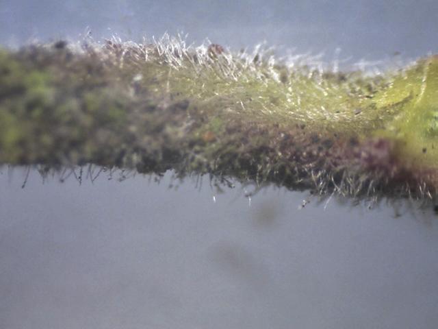 Calyx shallowly cup-shaped, without conspicuous lobes. Plant pubescent, not hirsute. Abaxial leaf surface with brown scales but without hairs, grayish white; corolla 0.9–1.3 cm
