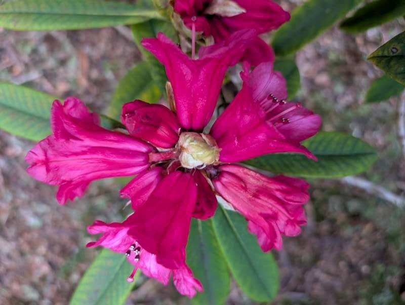 R. jingangshanicum (gingonshanicum), P.C. TAM (1982) (Fortunea). Red flowers C & N 6162 + 6165 Emei Shan 1850 m. 760+761. ARS2008. Ligner lidt R. calophytum. Bladene er ca. 35-45 cm. lange, bladstilk 3 cm. og stritter mere end R. calophytum. 6-8 blomster der er rør-klokkeformede på en kort (2 cm?) blomsterstilk. Omkring? 14-16 støvdragere, blomstrer i september, men den viste klon blomstrer i april.