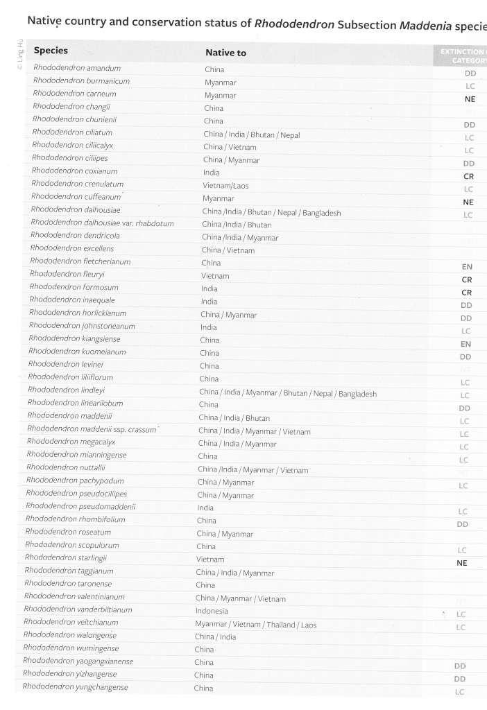 ● = på listen over truede arter (The Red List of Rhododendrons) Maddenia red list 2025 fra RHS årbog p134
