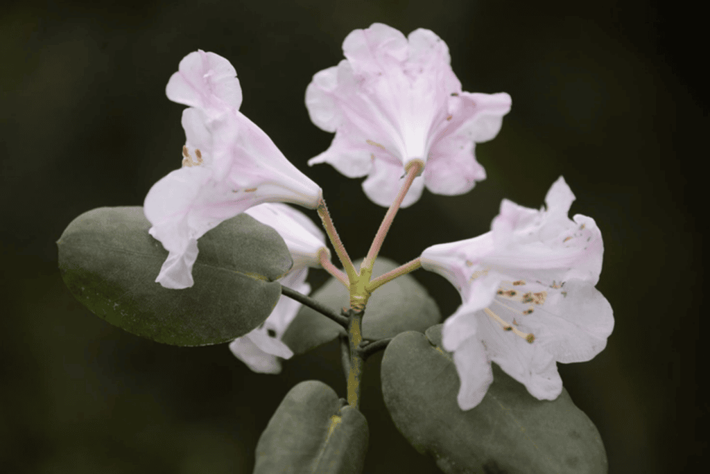 R. nymphaeoides (Fortunea). Flora of China (Google translate). Små træer; nyskud ca. 3,3 mm i diam.; unge skud glatte. Bladstilk 27–33 mm, glat; bladet læderagtigt, ægformet til bredt elliptisk, 4,7–6,3 × 3–3,8 cm; basis hjerteformet, spids stump/spids; bladoverflade grøn, glat; midt ribben fremtrædende, rillet, laterale vener 7-parrede og let hævede, flade. Blomsterstand racemose-skærmformet, 3-5-blomstret; blomsterskaft 20–25 mm, glat. Blomsterstilk 3–3,7 cm, sparsomt kirtelhåret; bæger 1–1,6 mm, rød kirtelhåret yderside, rand bølget, ciliat; Blomsten klokkeformet, pink , ca. 4,5 cm, glat; lapper 7, ca. 1,5 × 2,3 cm; støvdragere 14, 1,5-2,7 cm, støvdragere hårede ved basis; frugtknuden, ca. 5 × 3,5 mm, tæt rød kirtelhåret; griflen ca. 2,8 cm, ligeledes kirtelhåret til spidsen; støvfang, ca. 4 mm i diam. Kapsel ikke kendt. Fl. apr. ; vokser ved 900–1000 m. SØ Sichuan (Gulin).