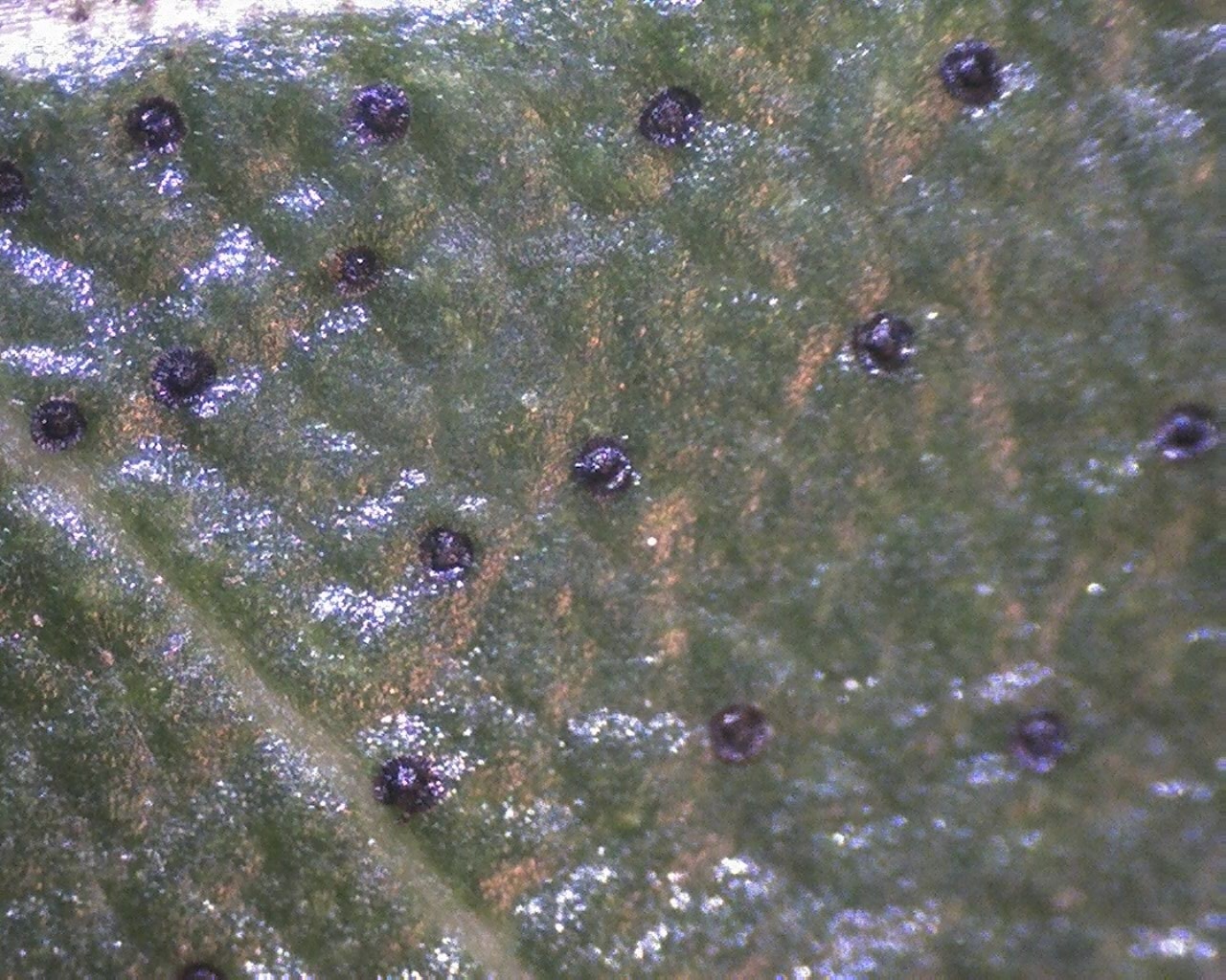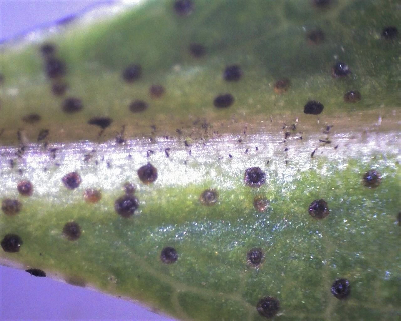 R. rubiginosum var. paucilepis FB 6-2015. Nærbillede af skæl (med kanter) på grønt blad i december. Foto: Finn Bertelsen