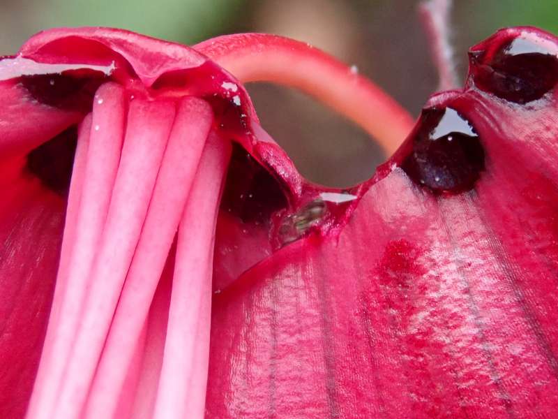 Shrubs, 2–4 m tall; young shoots tomentose and shortly glandular-hairy. Petiole 12–15 mm, glabrous; leaf blade leathery, oblong-ovate, 4.5–6 × 2.5–4 cm; base rounded; apex obtuse or rounded, apiculate; abaxial surface with a thick fulvous indumentum, hairs long-stipitate stellate; adaxial surface glabrous. Inflorescence umbellate, 4–6-flowered; rachis ca. 4 mm. Pedicel 1–2 cm, glabrous; calyx crimson, 3–5 mm, glabrous; corolla funnelform-campanulate, fleshy, deep carmine, 3.5–4 cm, with dark red nectar pouches at base, lobes 5, slightly spreading, round; stamens unequal, 2–3 cm, filaments glabrous; ovary oblong-conical, furrowed, ca. 5 mm, ca. 5-locular, glabrous; style carmine, ca. 2.8 cm, glabrous; stigma slightly lobulate. Capsule cylindric, straight, ca. 13 × 7 mm, calyx and style persistent. Fl. Apr, fr. Oct.