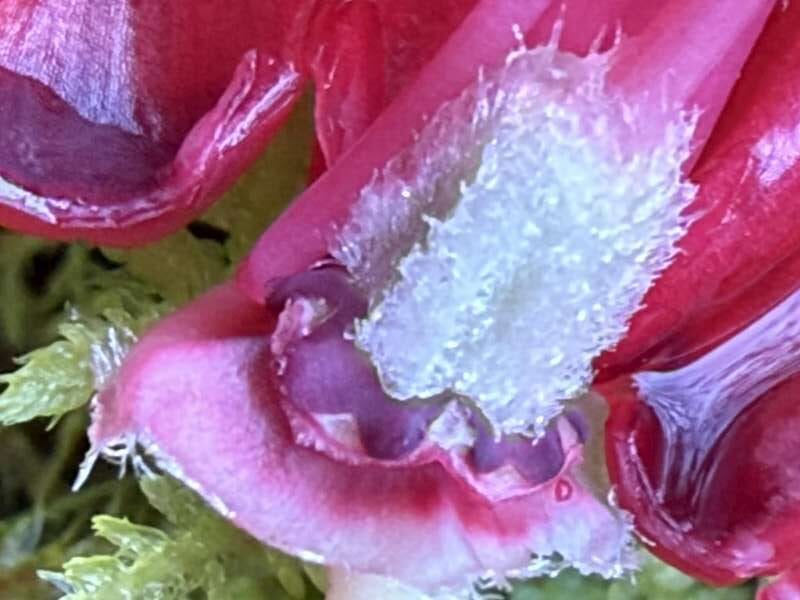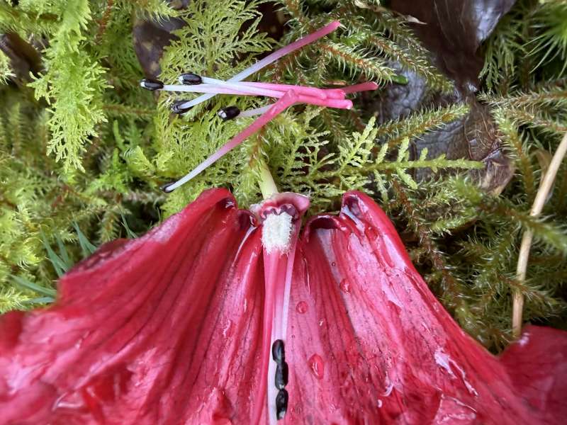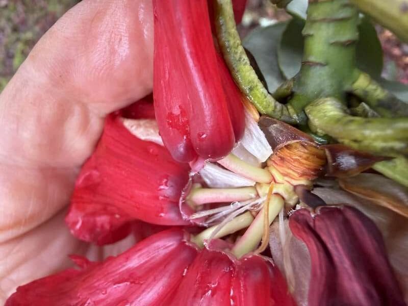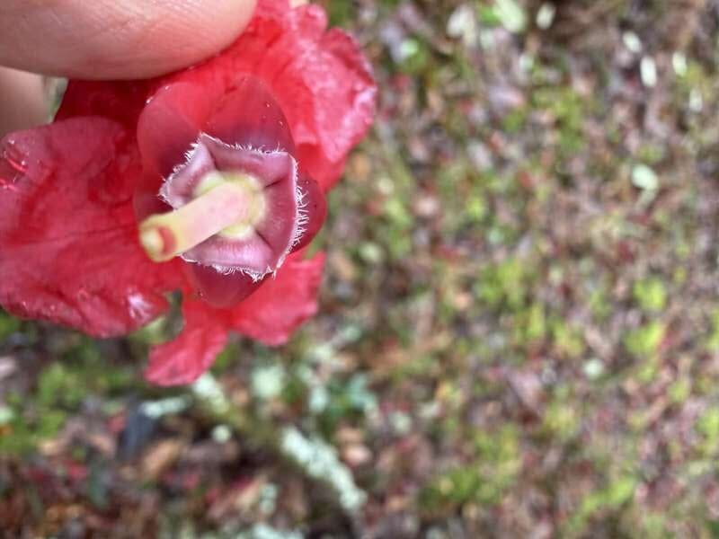 Shrub or tree, up to 14 m; bark smooth and peeling; young shoots apparently tomentose. Leaves 7–10.5 × 2–3.5 cm, oblong, base more or less rounded, upper surface glabrous, lower surface with epidermis lacking papillae, with numerous red punctate hair bases on the veins, each with the vestige of fasciculate hairs, otherwise glabrous; petioles glabrous. Flowers up to 15, in a dense truss; calyx 4–5 mm, cupular; corolla fleshy, scarlet, with a few purple flecks, tubular-campanulate, with nectar pouches, up to 40 mm; ovary densely tomentose, lacking glands, style glabrous. Flowering April. Royal Horticultural Society (1997).