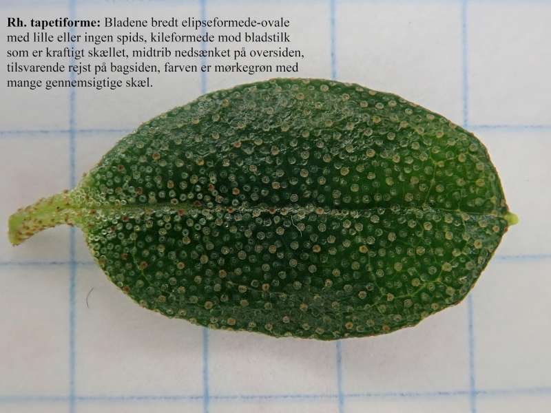 R. tapetiforme (Lapponica). Lav tæt busk, der kan nå op på 1 m. Blomsterne kommer i april og er purpurrød-blå, rosa eller sjældent gul. En art, der er sjælden i kultur og ofte fejlbestemt. Arten gror på åbne alpine skråninger og bare skærmen fra 3.000 til 4800 m i NØ-Burma og Kina. Kendetegn er de ovale blade med ensfarvede mørkebrune / rødbrune tætsiddende skæl på bladundersiderne. Kan skelnes fra R. nivale ssp. boreale ved dennes spidse blade og de spredte mørkere skæl på bladenes underside.