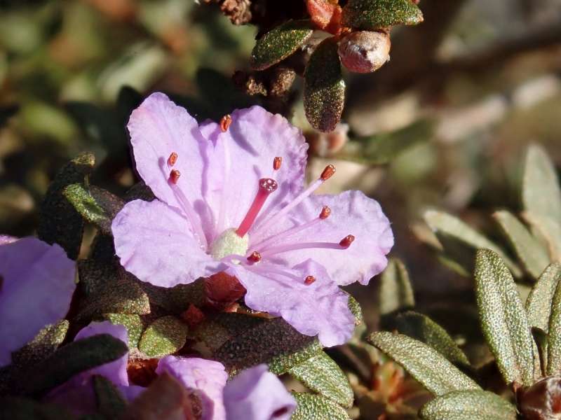 Små, meget forgrenede, oprette buske og grene, 0,3-1,3 m høje; grene tæt mørkebrun skællet. Bladstilk 1-2 mm, skællet; bladblade elliptisk, aflang, snævert omvendt ægformet eller ovale-lancetformet, (0,3-)0,5-1,2(-1,8) × (0,18-)0,2-0,5(-0,7) cm; base snævert tragtformet; bladspids spids eller stump, sædvanligvis med kort mucro; bladundersiden gullig grøn, skæl tilstødende eller overlappende, bleg brun, sjældent blandet med et par ravfarvede; bladoversiden lysegrøn, tæt skællet, sølvfarvede eller lysegule. Blomsterstand 1 (eller 2)-blomstret. Blomsterstilk 0,05-0,15(-0,2) cm, skællet; calyx ubetydelig; lapper 0,5-1,2 mm, trekantede, ovale til afrundede, skællet, skællene forskellige, calyxrand håret eller ej; kronen bredt tragtformet, bleg lavendel-blå til dyb lilla, 0,6-1,2 cm, rør (2-)3-4 mm, ydre overflade normalt skællet, hals håret; støvdragere 10, 1-1,4 cm, længere end kronbladene (må være en fejl, HE), støvdragere håret mod basis eller glatte; ovariet ca. 1 mm, skællet; griflen 3-6 mm eller 9-16 mm, normalt glat, sjældent med et par skæl eller hår nær basis. Kapsel, 2-3(–4.5) mm, skællet. Blomstrer Maj-Juni og Sep-Oktober. Skove, krat, krat, åbne alpine skråninger, åbne fugtige skråninger; 2400-4800 m. Gansu, Qinghai, N Sichuan.