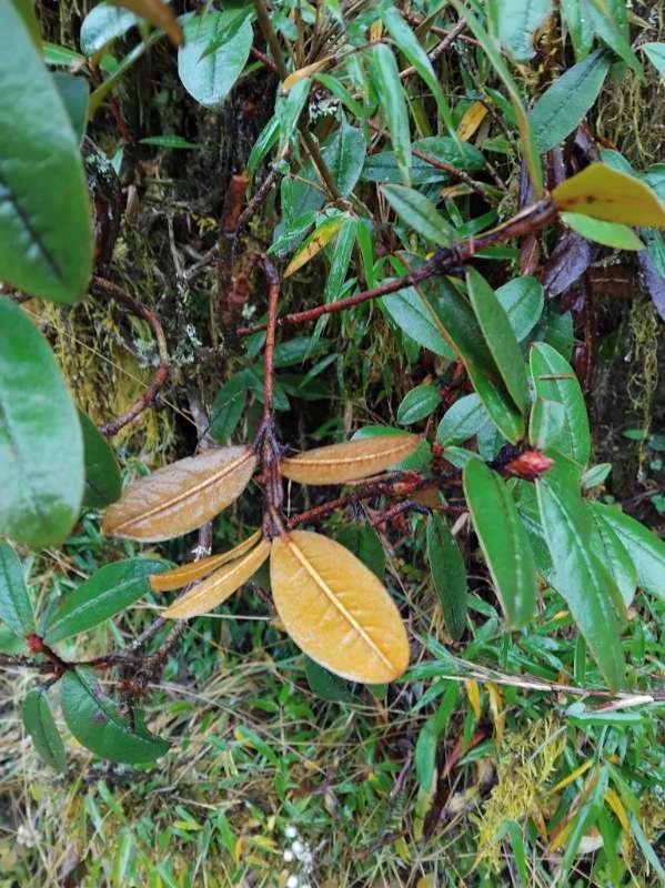 Rødbrun nyvækst samtidig med blomstring (Kan være en R. decorum)