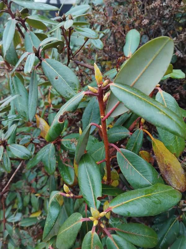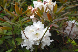 Rødbrun nyvækst samtidig med blomstring (Kan være en R. decorum)