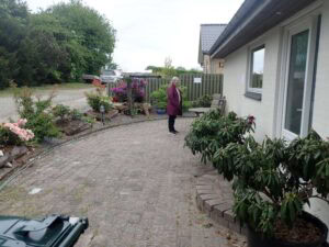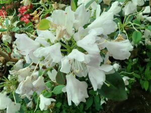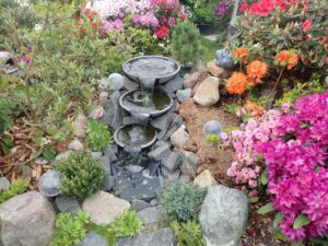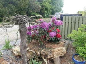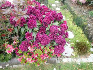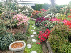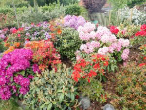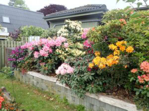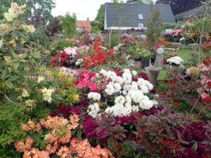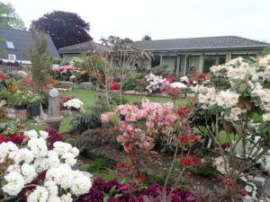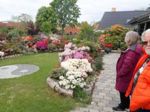 Flot have med mange storblomstrede hybrider. Selv om haven er lille og kun 3 år gammel, er der mulighed for at se en nyanlagt beplantning med finurlige løsninger for at få plads til en del rhododendron og azalier. Haven er anlagt med fremtiden for øje, så der er mulighed for at færdes med rollator.
