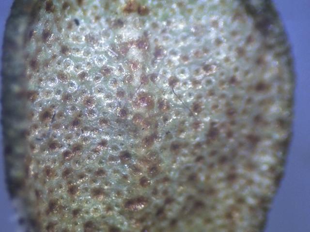 R. nivale ssp. australe (Lapponica). Lavtvoksende busk med spidse blade. Calyx-bladrandene er dunede og ikke skællede.